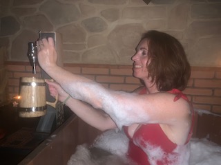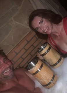 Having changed into our swimsuits, the vivid sunshine outside was a challenging contrast to the cellar type of room we were led to for our spa experience. As my eyes adjusted, I could make out 5 or 6 barrel style jacuzzi baths and a member of staff carefully helped me climb the stairs to get in and find my footing. I could see why this was quite important as the way back out would for sure be more difficult after a few beers. Relaxing in our boozy bubbles, a blend of herbs and spices was added to the water and we were shown how to fill our huge wooden mugs from our own personal tap. Apparently we were allowed 5 refills each, but I knew there was no way we'd manage that. I couldn't picture standing up after that, never mind contemplating the slippery stairs back out. I couldn't help but wonder how many accidents there had been...
